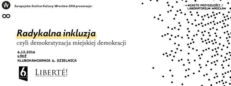 Tygodnik „Polityka”, Magazyn Liberté! i Edwin Bendyk, kurator programu „Miasto Przyszłości / Laboratorium Wrocław” realizowanego w ramach Europejskiej Stolicy Kultury Wroclaw 2016 zapraszają na seminarium: Radykalna inkluzja, czyli demokratyzacja miejskiej demokracji Spotkanie odbędzie się 5 grudnia 2016 r. w godz. 17.00 – 20.00 Miejsce: Klubokawiarnia 6 dzielnica, ul. Piotrkowska 102, Łódź ∞ ∞ ∞ ∞..