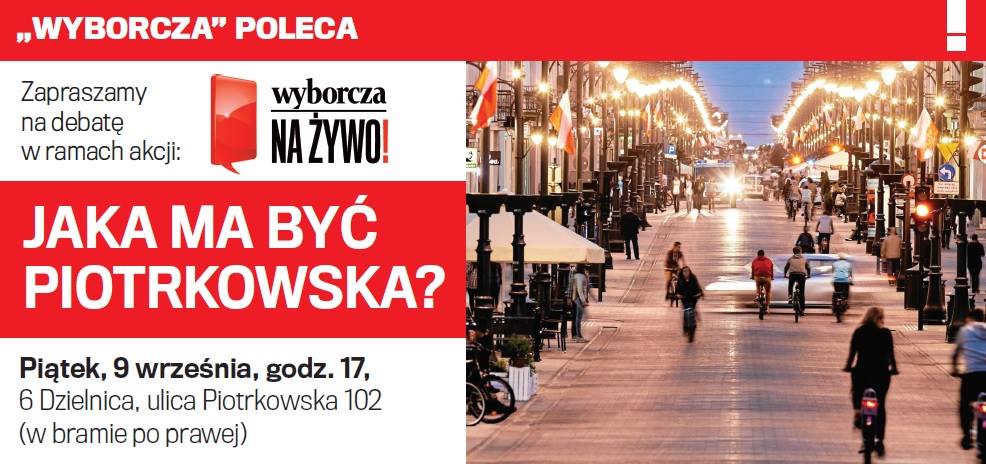 Na debacie o tym jaka ma być Piotrkowska nie może zabraknąć Was i nas. Organizuje Gazeta Wyborcza. Gości 6 dzielnica. Prowadzi Szymon Bujalski. Mądrzą się Marek Janiak, Mario E. Sokół, Piotr Paweł Kurzawa. Przyjdźcie i sprawcie by nie mądrzyli się za mocno